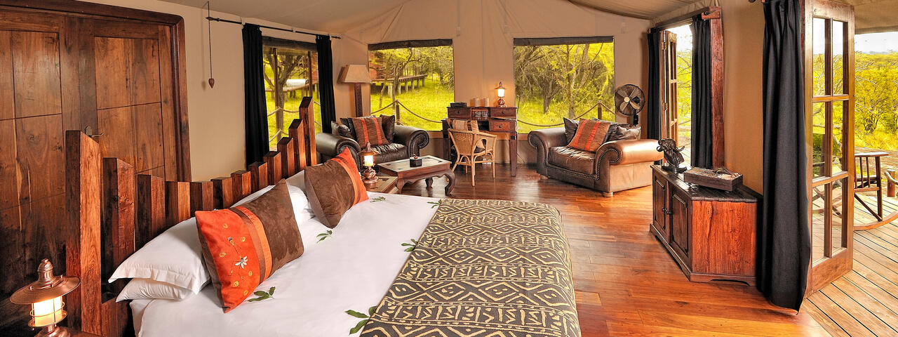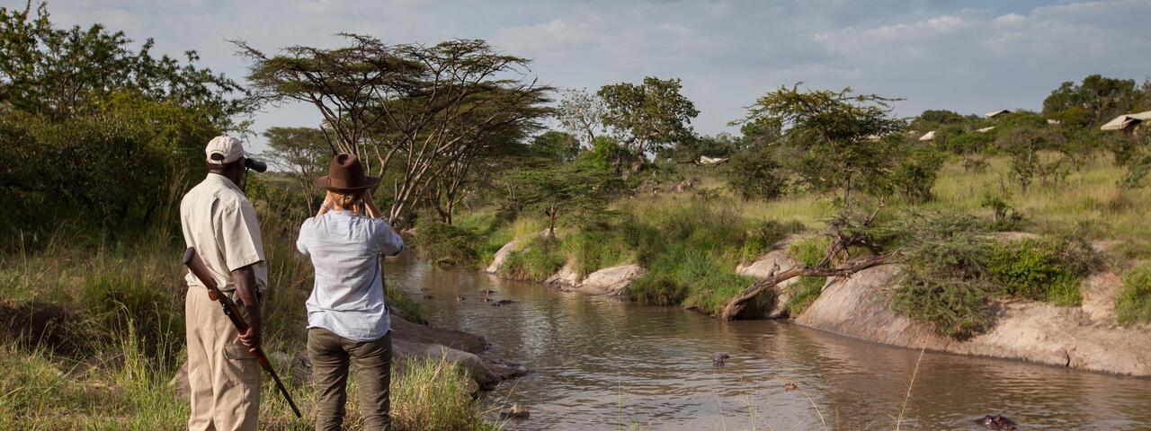 Tucked among weathered boulders and acacia trees in the north central Serengeti, this elevated camp is poised at the starting point of the Great Migration, which begins around June each year. Flowing beside it, the Grumeti River is thick with wallowing hippos, their grunts echoing around camp. Even outside of migration season, the sunburned savannah is rich in wildlife, making it possible to observe the Big Five along with giraffes, cheetahs, hyenas, primates and hundreds of bird species.
