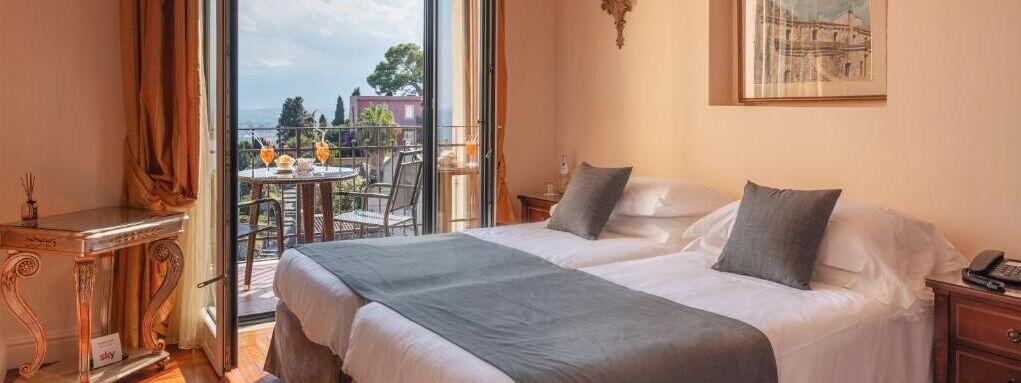 The restored 20th century villa combines Roman architecture with modern facilities showcased across 63 rooms and suites. You’ll find rooms are stylishly furnished with rich fabrics and classic Sicilian decor offering views of the lush gardens, Mount Etna or the Ionian Sea.
