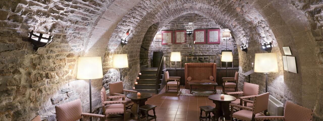 Accommodation here is a harmonious fusion of historic character and contemporary luxury. Guest rooms and suites reflect the fortress’s legacy with vaulted stone ceilings and archways, traditional tapestries and, in some cases, grand four‑poster beds, alongside modern comforts including air conditioning, Wi‑Fi and minibars. Many rooms offer panoramic views over the landscape below, inviting you to unwind in an atmosphere that feels both intimate and timeless.